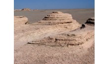 且末古城位于且末縣城西南約6公里的老車爾臣河岸臺(tái)地上,海撥款1,273米,遺址地表無植被,已沙化,呈雅丹地貌。在東西長約1公里,南北寬200米的范圍內(nèi),地表散布著大量陶片及鐵塊,煉鐵渣,曾采集到數(shù)件磨盤石殘塊,玻璃片,料珠。此外,在遺址中心區(qū)風(fēng)蝕地表,尚殘存數(shù)間房屋及其他建筑遺址,1985年9月挖掘出的古代毛織品,古尸,遍地尸骨墓室,還有陶片弓箭。